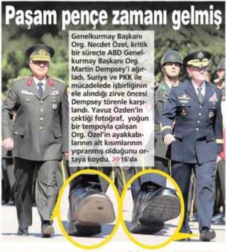 «Τελικά τα παπούτσια του τούρκου αρχηγού των Ενόπλων Δυνάμεων είναι τρύπια ή όχι»; Oλη η Τουρκία συζητά αυτό το θέμα με αφορμή το πρωτοσέλιδο δημοσίευμα της Milliyet που εμφάνιζε τον Νετζνέτ Οζέλ να υποδέχεται τον αμερικανό ομόλογο του Ντέμπσεϊ στην Άγκυρα.Στην τελετή υποδοχής η φωτογραφία της Milliyet το ένα παπούτσι του Οζέλ φαίνονταν να έχει τρυπήσει . Η τουρκική εφημερίδα είχε ως ειρωνικό τίτλο «πασά μου ήρθε η στιγμή να αλλάξετε σόλα στο παπούτσι σας”…
