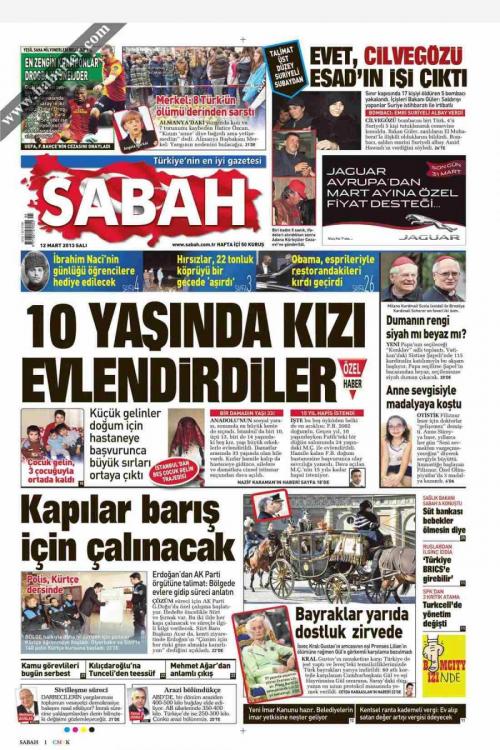 «Πάντρεψαν 10χρονο κορίτσι» είναι ο τίτλος της Sabah. H τουρκική εφημερίδα αποκαλύπτει πως στην Κωνσταντινούπολη έχει παντρευτεί ένα δεκάχρονο κορίτσι, τρία κορίτσια 13 ετών και άλλα πέντε δεκατετράχρονα κορίτσια. Οι γαμπροί ήταν μεγαλύτεροι μάλιστα ο ένας είχε 33 χρόνια διαφορά με τη νύφη…