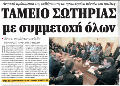 «Ο Φιλελεύθερος» με κύριο τίτλο «Fund σωτηρίας επί τάπητος» γράφει πως τη συναίνεση των πολιτικών δυνάμεων αλλά και όλων των οργανωμένων φορέων της κυπριακής κοινωνίας επιζητεί η Κυβέρνηση, σε μια ύστατη προσπάθεια να πετύχει την ομοφωνία για την προώθηση στο κυπριακό κοινοβούλιο νομοσχεδίου που να καλύπτει το ζητούμενο ποσό των 5,8 δις. ευρώ. Αλλού σημειώνει πως η Μόσχα έκοψε τα φτερά και τις ελπίδες της Λευκωσίας αφού τα νέα από τη Ρωσία δεν είναι ενθαρρυντικά. Αλλού σημειώνει πως αυξημένα μέτρα λαμβάνει από προχθές η Αστυνομία στην πρεσβεία της Γερμανίας, ενώ επιπρόσθετα μέτρα ασφαλείας λήφθηκαν ακόμη σε μια πρεσβεία και ένα προξενείο: της Ολλανδίας και της Φινλανδίας αντίστοιχα.
